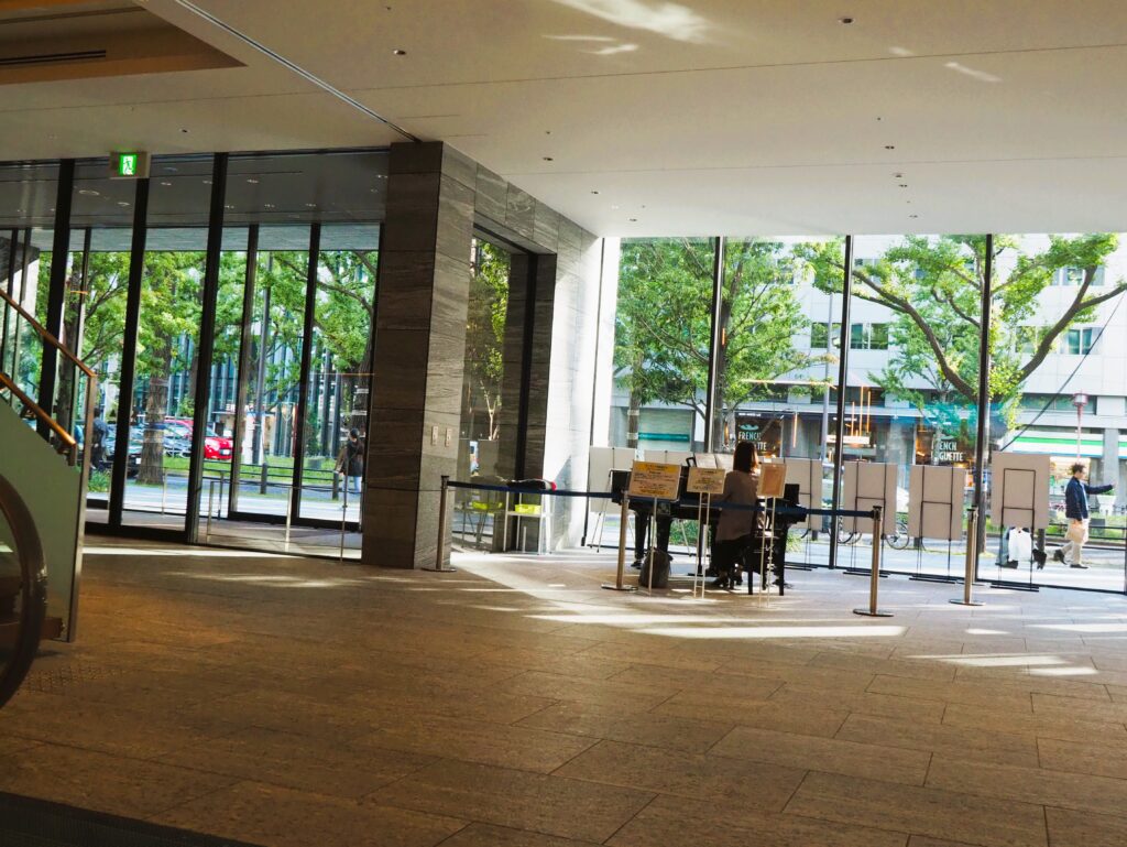 神社の隣にはオービックビルがあり1階にはストリートピアノがありました。