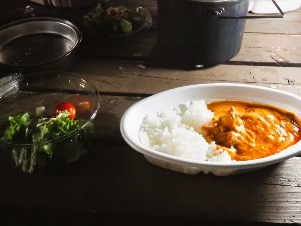 夕飯はカセットコンロでご飯を飯盒で炊いてレトルトのバターチキンカレーを鍋で湯煎しました。