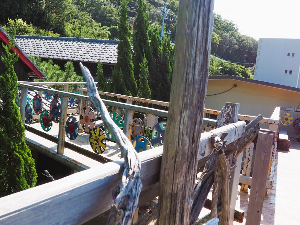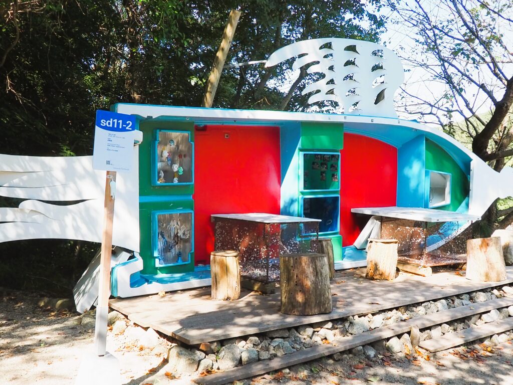 船をペイントして貝殻や写真などで飾り付けし、手前には休憩できる?テーブルとイスが置いてありました。