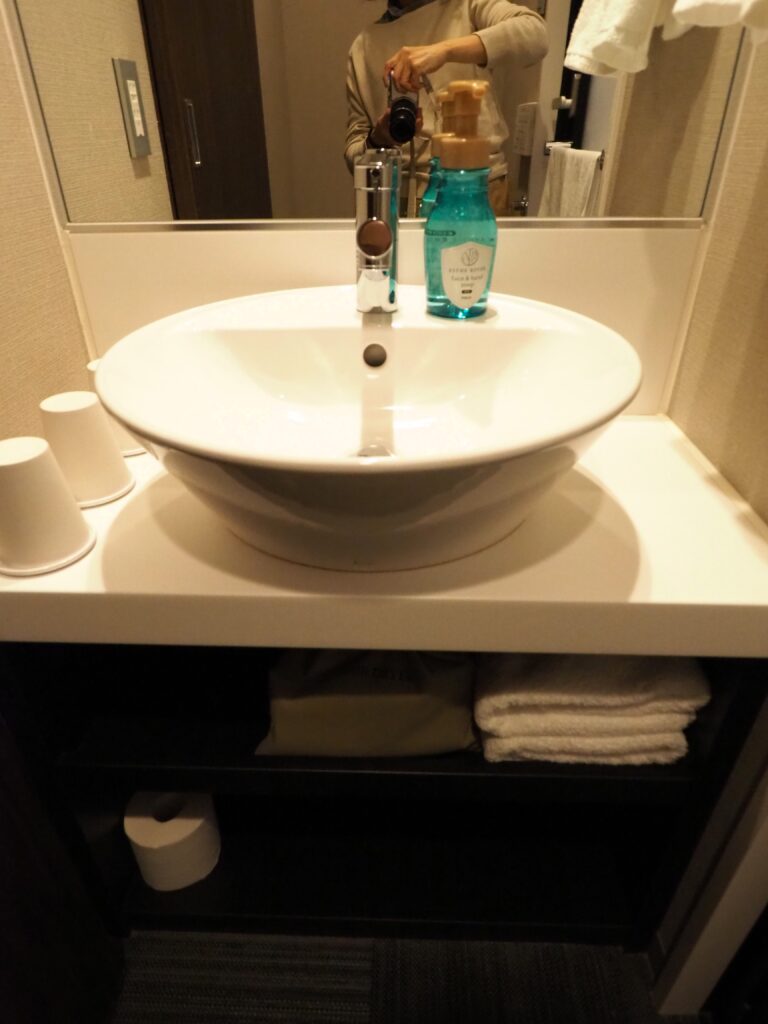 洗面はアメニティなど置くところがあまりないので手狭ですが、下に棚があるので棚に置いたりしていました。